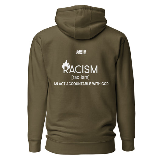 RACISM - AN ACT ACCOUNTABLE WITH GOD - WHITE FONT - BACK of Hoodies