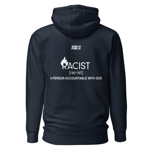 RACIST - A PERSON ACCOUNTABLE WITH GOD - WHITE FONT - BACK of Hoodie